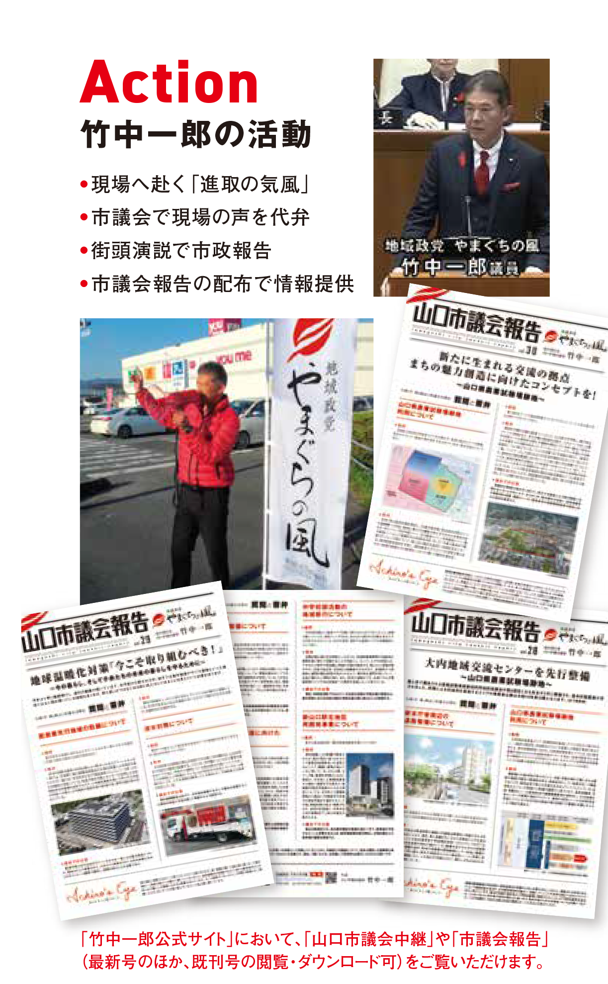 現職 地域政党 やまぐちの風 代表 竹中一郎事務所 代表 有限会社 恵美 代表取締役 山口商工会議所 1号議員 公益社団法人 山口法人会 理事 一般社団法人 山口県法人会連合会組織委員会 副委員長 山口県防衛協会青年部会 顧問 山口市自衛隊協力会 常任理事 自衛隊山口地方協力本部協力会 副会長